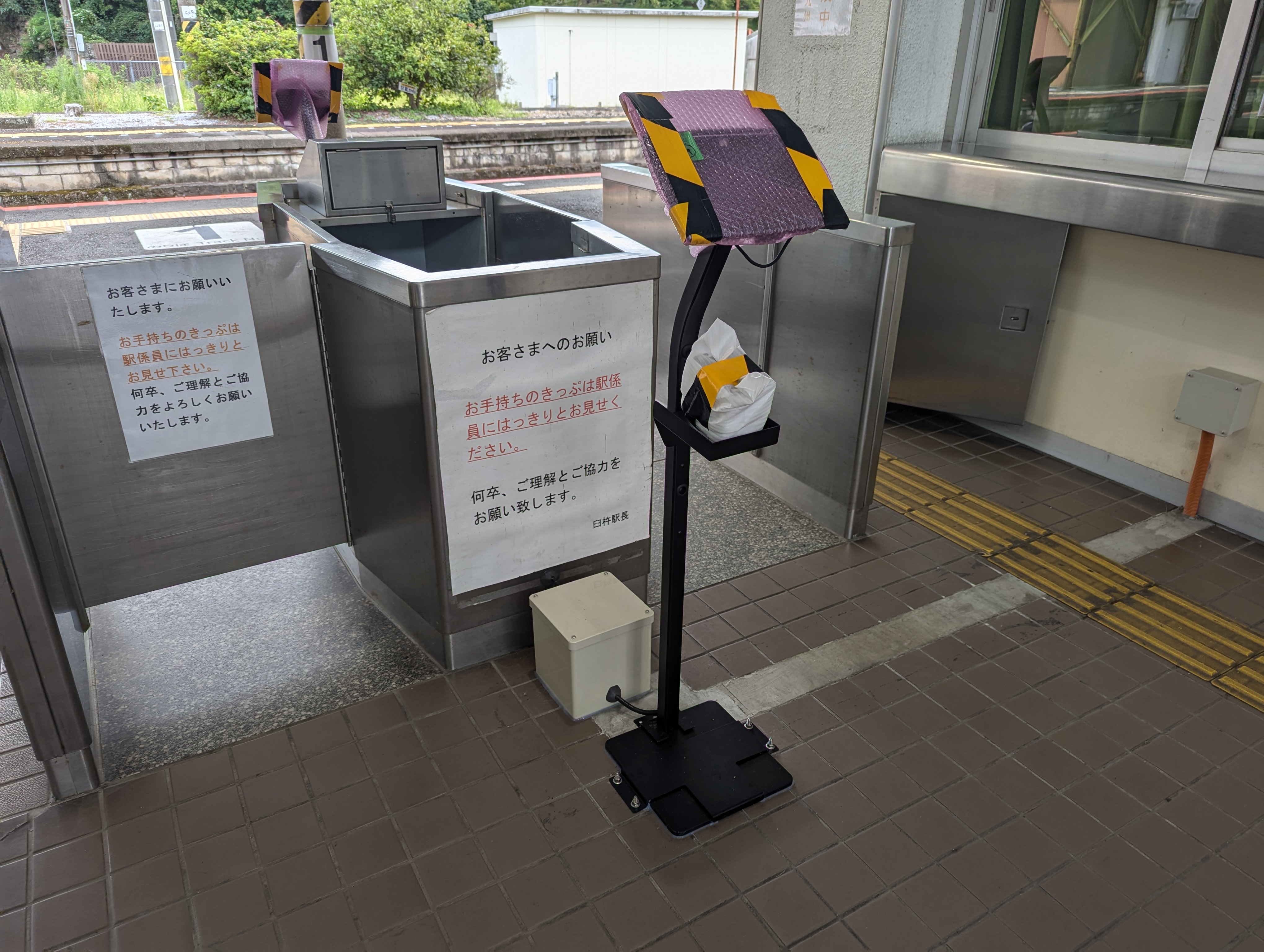 なお、前世代の「GX-7」を導入している駅では、スタンドタイプの改札機をもっと簡略化したタイプの改札機が壁に設置されています。