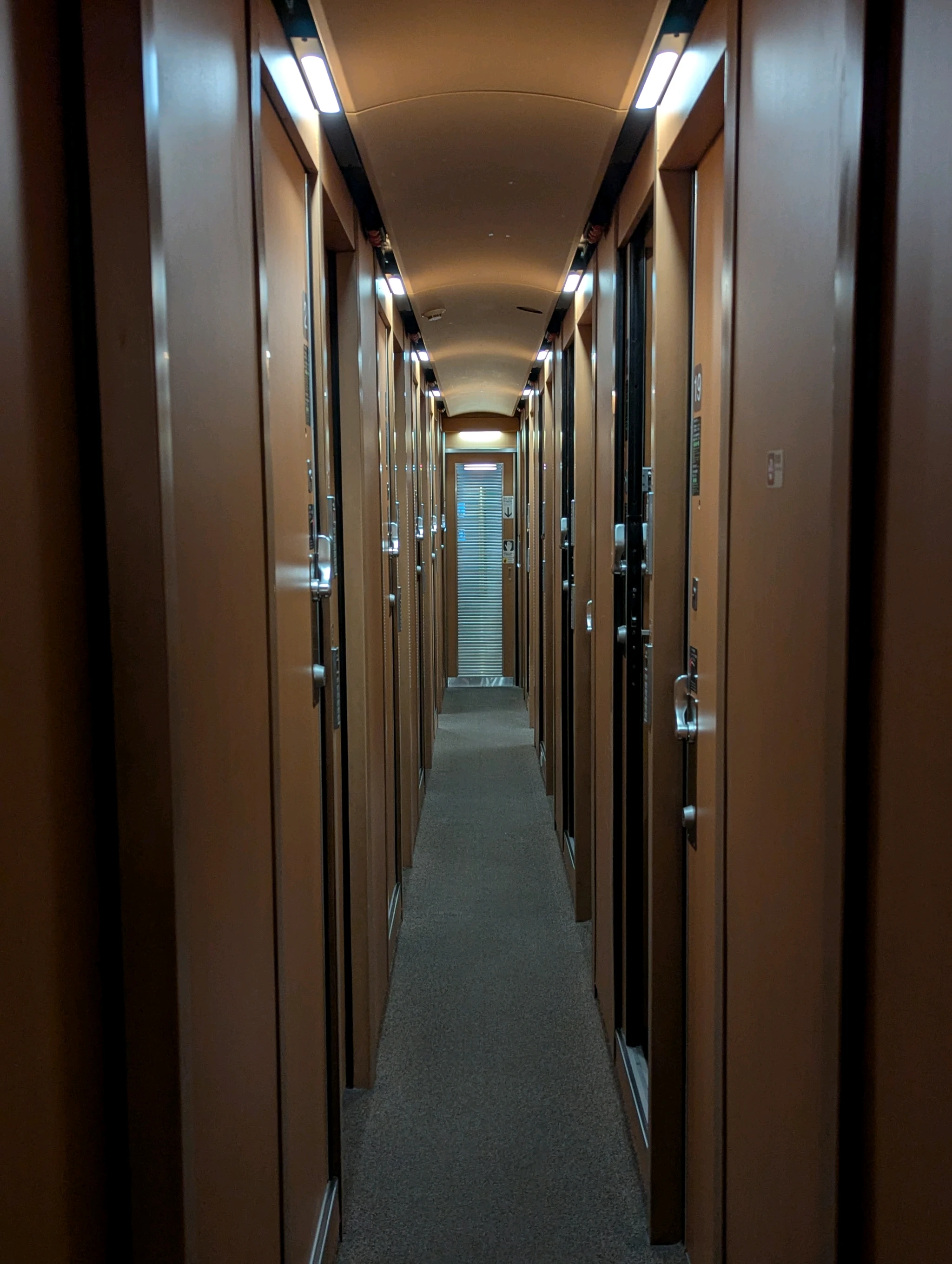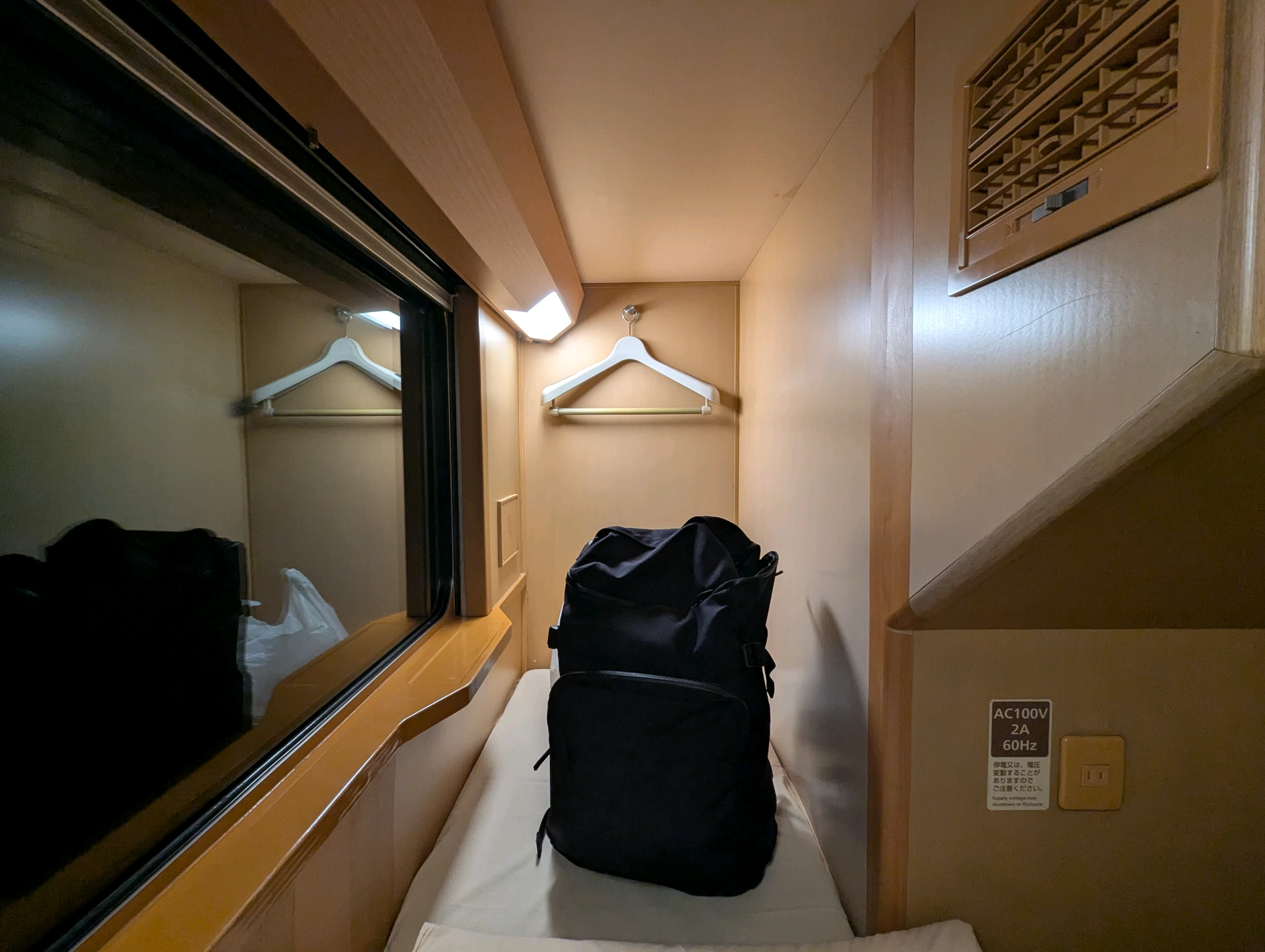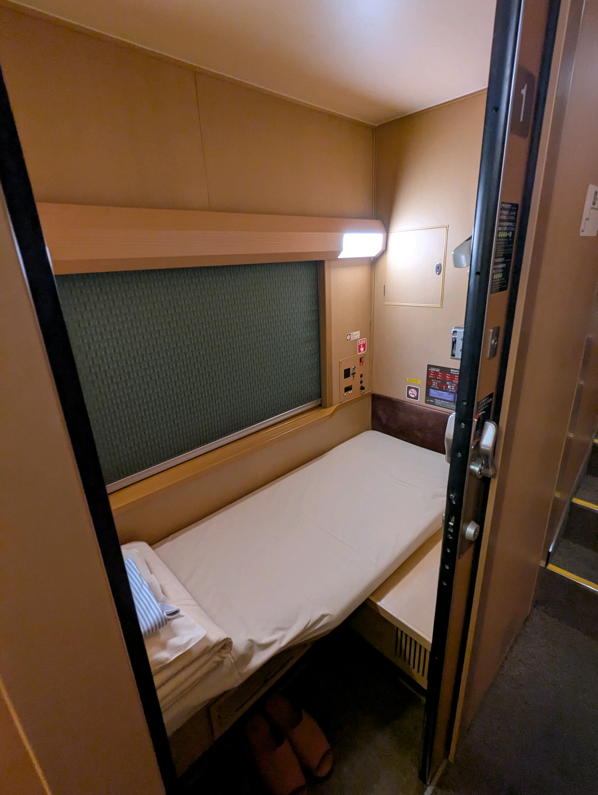 部屋が非常に狭く、モーターなどの機器が搭載させているため、居住性は他の客室と比較して劣るようですが、その分値段が安かったので「サンライズエクスプレス入門」にはちょうどよかった気がします。(「のびのびシート」は別。私はちゃんと寝たいのさ。)