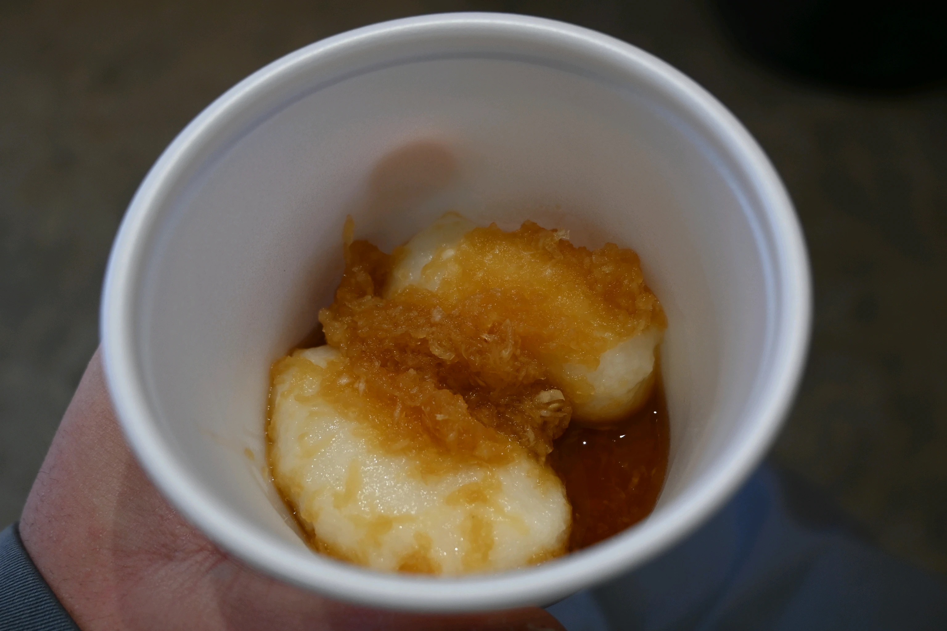 その店の向かいにあった店「亀屋」の「からみ餅」という大根おろしと醤油のタレのかかった餅を食べました。