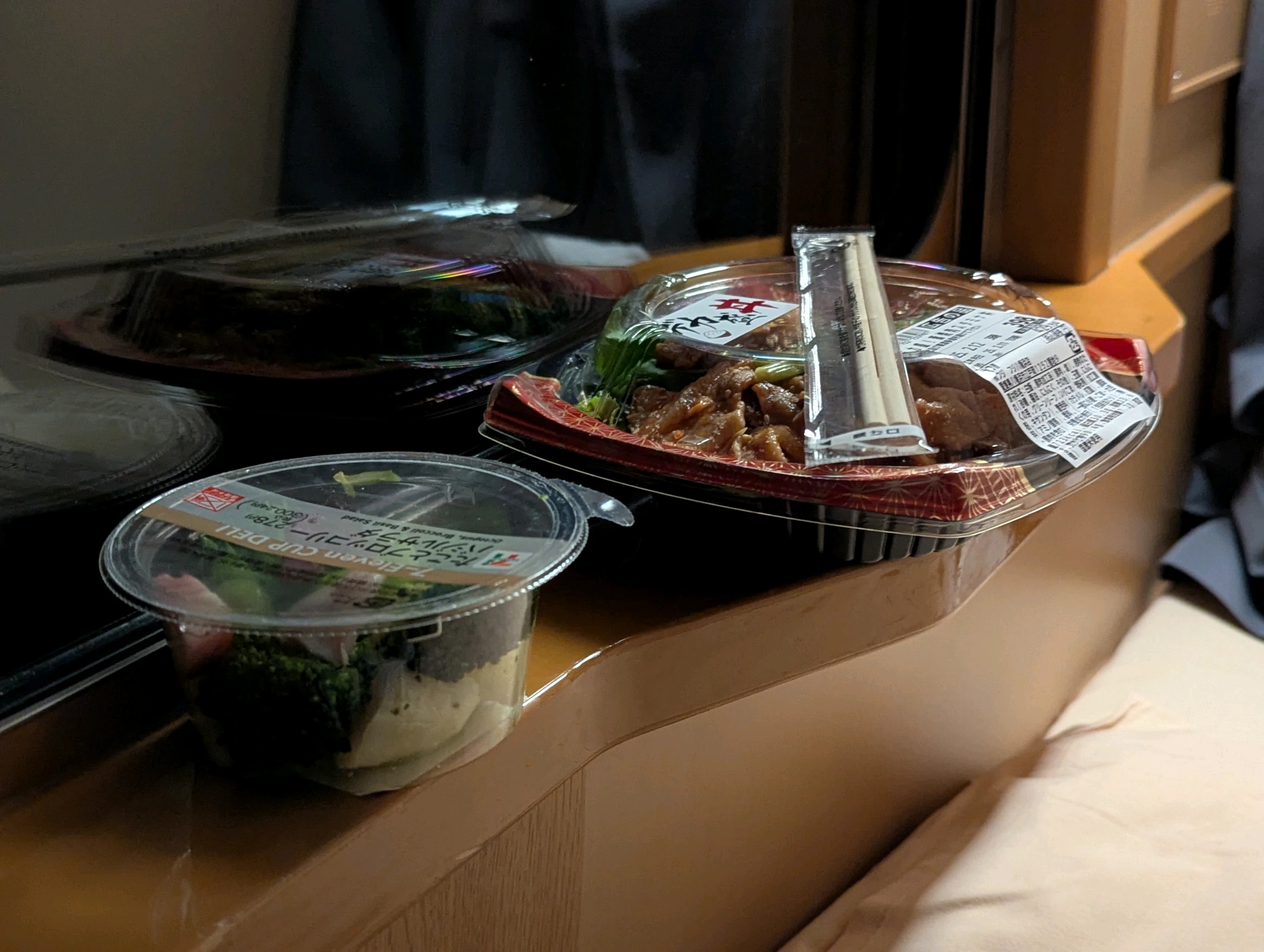 八幡浜のフジで買い物をした分に加えて、高松駅のセブンイレブンでカップデリと野菜スティックを購入しましたので、これでもう満足ですね。